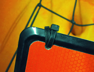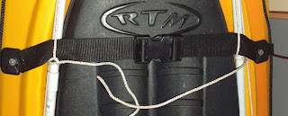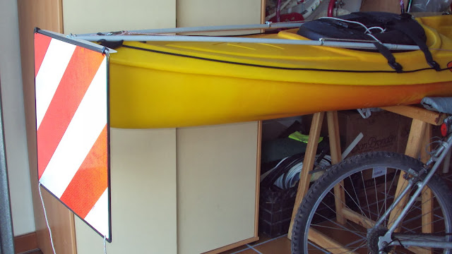 Aprovecho los cordones de la asa de transporte para fijar el extremo de la señal en la punta del kayak.