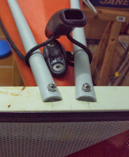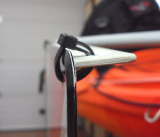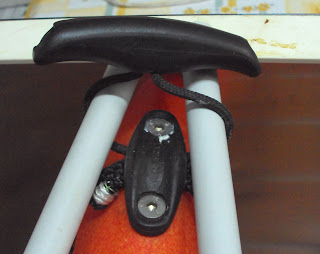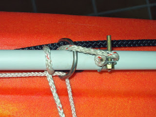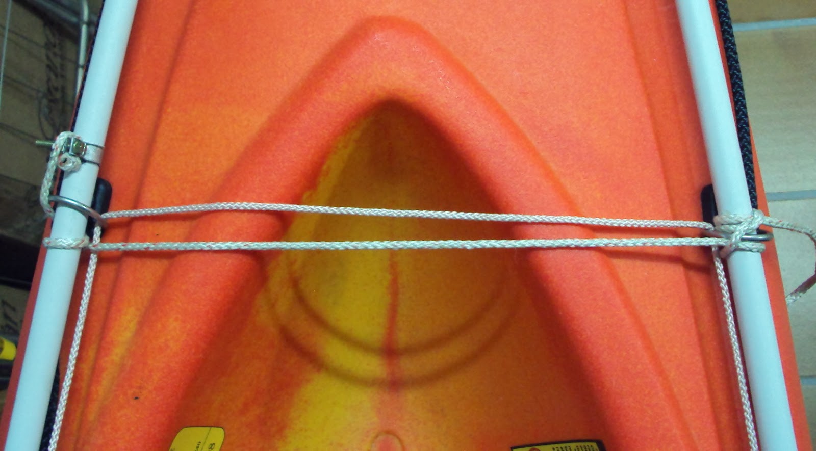 Una abrazadera de las que se usan para las gomas del butano anclada en uno de los tubos de PVC trincando el cordón para atarlo a las anillas del kayak.