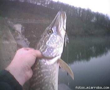 Llego a eso de las 6 :15 pero hasta las 7 y pico no se ve ni ostias cucharilla de lana roja y a lanzar , tras variosc lances pica el primero " Modelo Standar " pero os puedo decir que una gozada muchas arrancadas hacia el fondo pero muchas ,no queria salir a la superficie , besito y al agua , despues de varios lances otro lucio al igual que el otro con muchas carreras y muy muy divertido, luego a llegado el momento en el que  e sacado el retrasado que todos llevamos dentro  :lol:   Lanzo y como hay mucha profundidad siempre dejo que la cuchara baje hasta el fondo y al empezar a recojer se engancha, tras varios intentos por recuperar la cucharilla decido cerrar el freno a tope y romper pero no rompe y la cucharilla consigue liberarse y se ve que alguien estaba esperando a que la cucharilla cobrase vida y me mete una buena picada , lo traigo casi hasta la orilla pero sin verlo , se nota que es grande  y en esto que me hace una arrancada al fondo y cuando voy a darle linea o retrasado de mi tenia el freno cerrado a tope y a partido  :x     pero en fin , tres peleas y dos lucietes   hay van unas fotos con el movil :