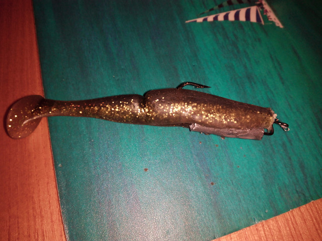 No se ve muy bien..pero por lo que asoma la curva del anzuelo por el lomo del vinilo y la pinta de la cabeza..no esta el codo del anzuelo al aire?yo a eso le daba mas talla y un anzuelo curvo.